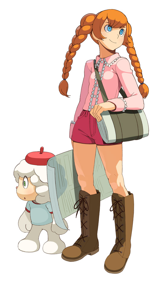 00sbagblue eyesbootsbraidorange hairposter (object)shoulder bagsimple backgroundstandingtwin braidswhite background
