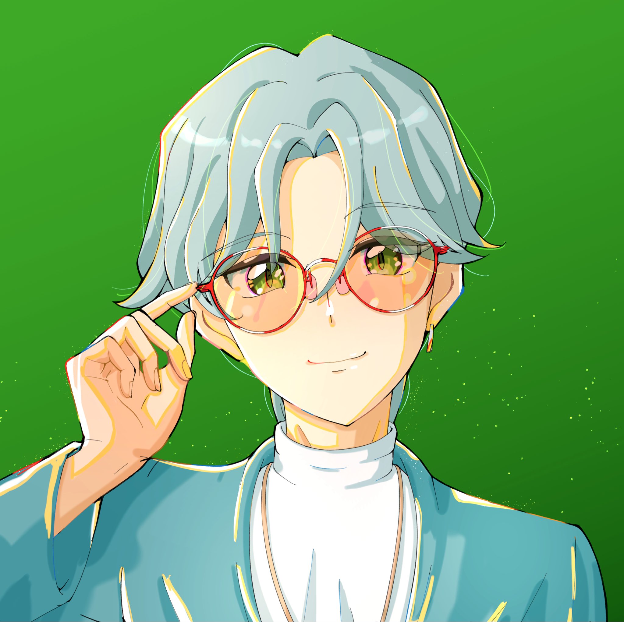 1boycardiganclosed mouthearringsglassesgreen backgroundgreen eyesgreen hairgreen shirthair between eyeshoop earringsjewelrylong sleeveslooking at viewermale focusmature malenecklaceopen cardiganopen clothesparted bangsshirtshort hairsmilesolosolo focussunglasseswhite shirt