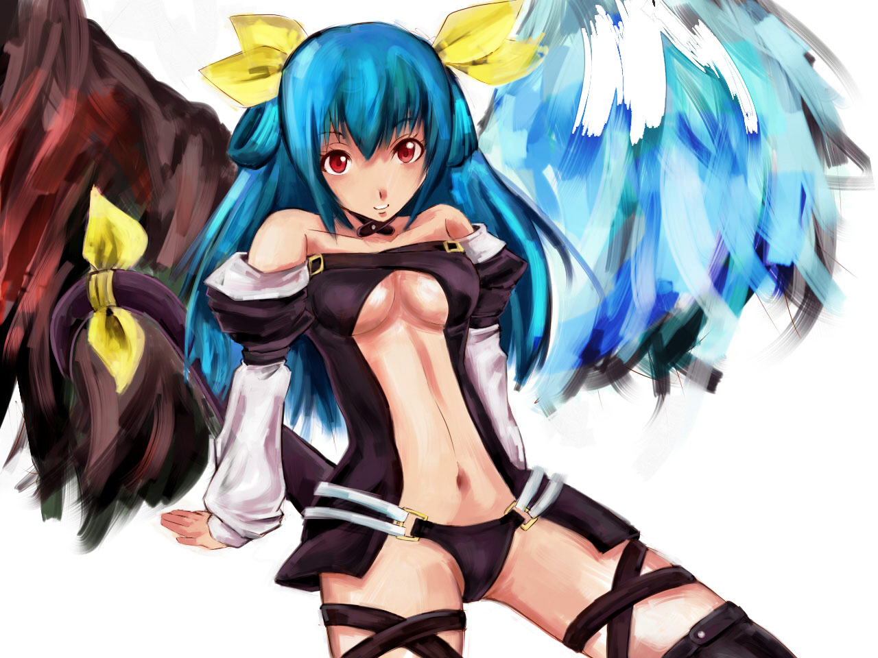 1girlasymmetrical wingsblue hairbowbreastsfemale focushair bowlong hairmidriffnavelred eyesribbonsittingsolotailtail ornamenttail ribbonthighhighsunderboobwings