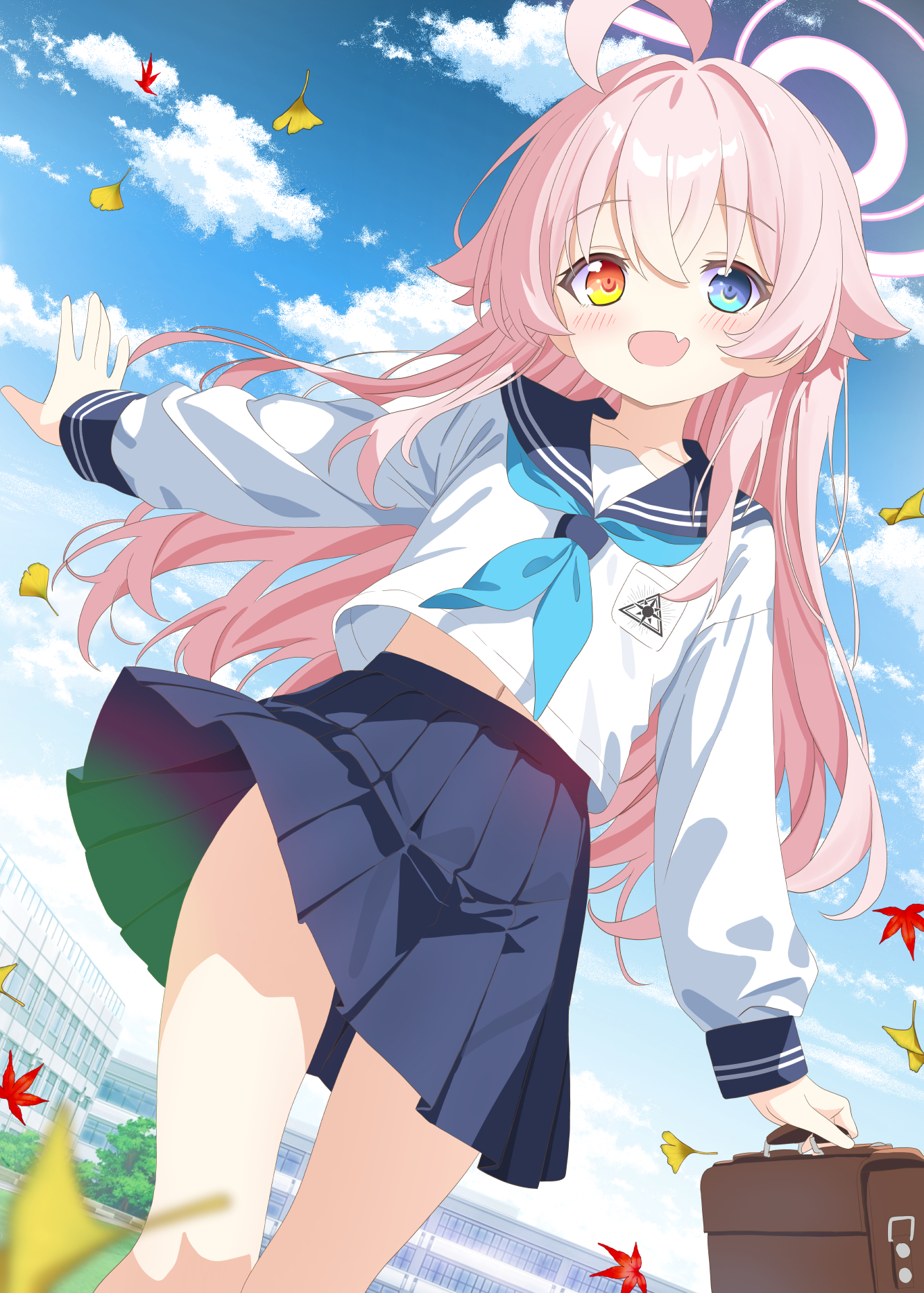 1girlahogeautumn leavesblue eyesblue skirtblushfalling leavesfanghair between eyeshaloheterochromialeaflong hairlong sleeveslooking at viewermaple leafmidriff peeknavelneckerchiefopen mouthoutdoorspink hairpink halopleated skirtsailor collarschool uniformserafukushirtskin fangskirtsmilesolowhite shirtyellow eyes