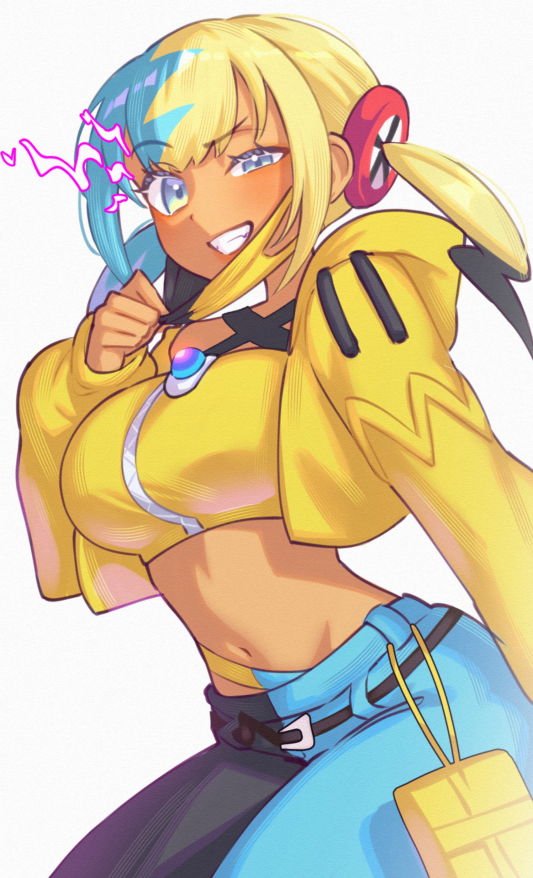 1girlaqua hairbandeaublack maskblack pantsblonde hairblue pantsbreastscriss-cross haltercrop topcropped jacketgrinhair ornamenthalterneckjacketlarge breastslong sleevesmaskmask pullmidriffmouth maskmulticolored hairnavelopen clothesopen jacketopen mouthpantsshort twintailssimple backgroundsmilesolosplit-color hairstomachstraplessteethtube toptwintailstwo-tone hairtwo-tone maskwhite backgroundyellow bandeauyellow jacketyellow maskyellow tube top