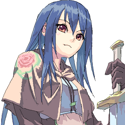 1girlblue hairbrown capeletbrown glovescapeletchest guardclosed mouthfloral printglovesholdingholding swordholding weaponlong hairlooking at vieweroekakiorange eyesrose printsimple backgroundsmilesoloswordupper bodyweaponwhite background