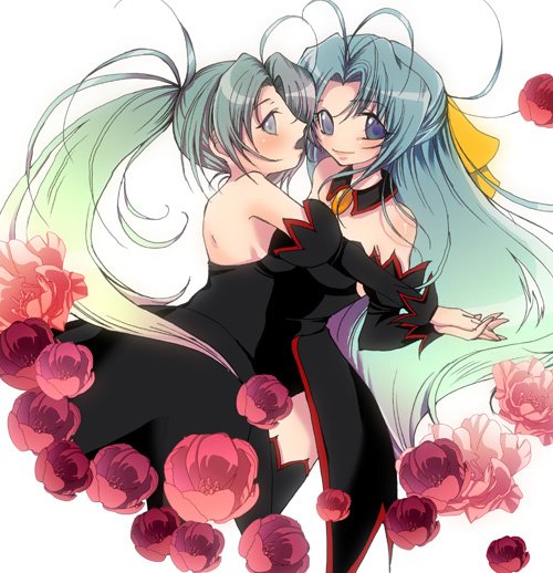 00s2girlsangel mortflowergreen eyesgreen hairhuglong hairmultiple girlsponytailribbonrosesiblingssisterstwins