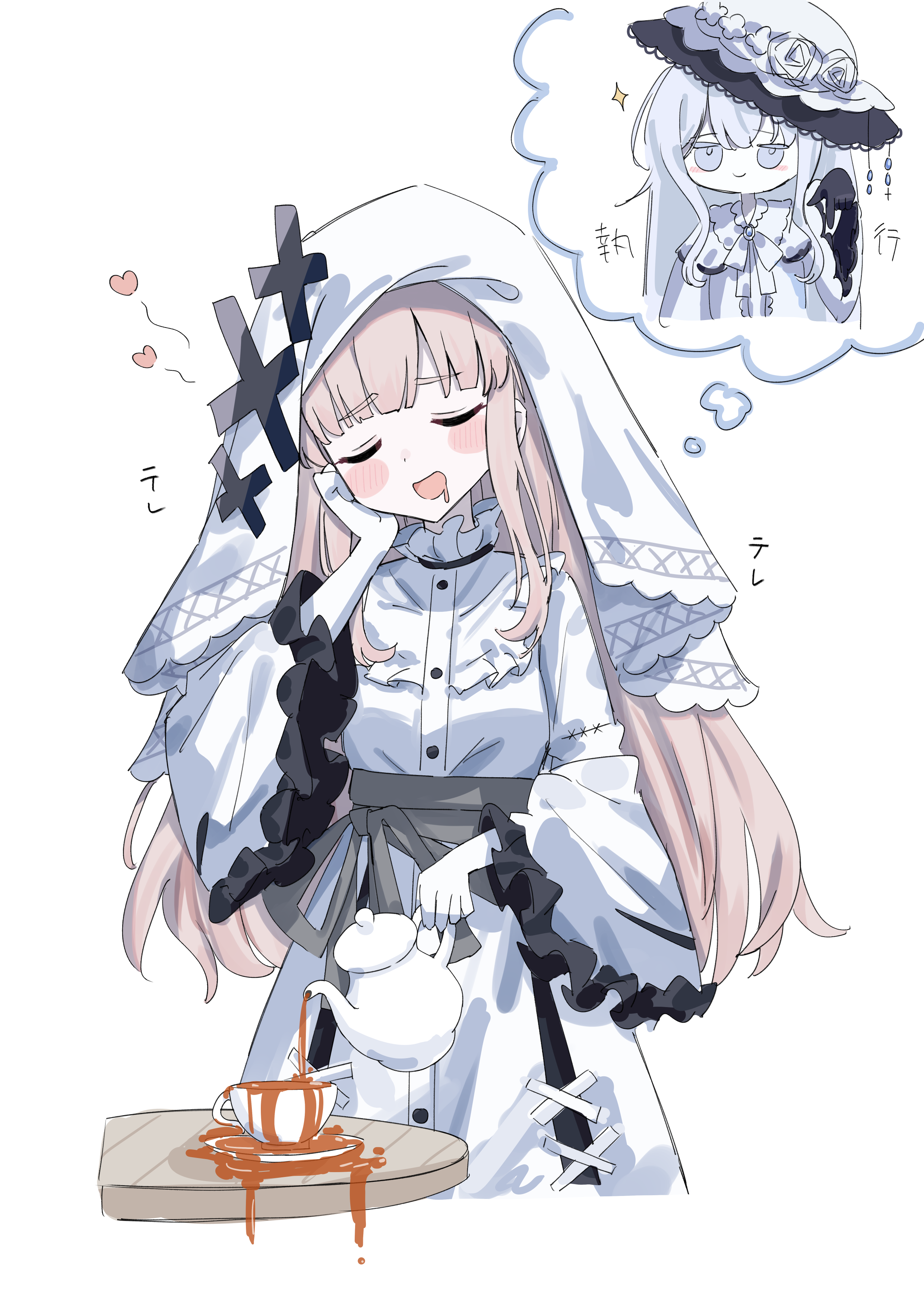 2girlsblushclosed eyescupdistracteddressdroolingflowerglovesgrey eyesgrey hairhatheartholdingholding teapotimagininglong hairlong sleevesmultiple girlsopen mouthoverflowingrosesalivasaucersimple backgroundspeech bubblespillingtableteateacupteapotthought bubbletsukishiro yukiveilwhite backgroundwhite dresswhite flowerwhite gloveswhite hatwhite rosewide sleeves