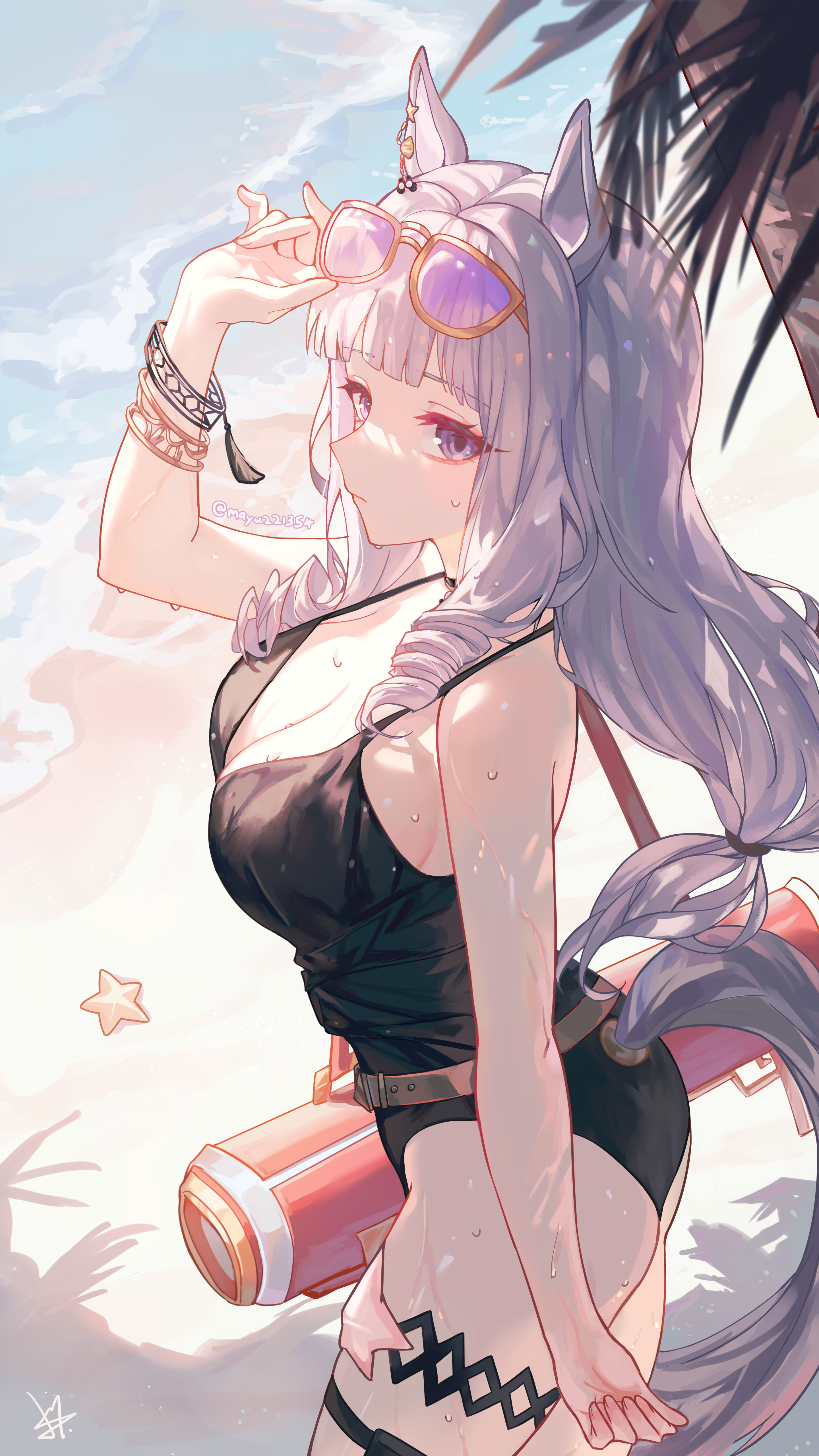 bubble99, original, absurdres, commission, highres, 1girl, adjusting hair, arm up, armpits, asymmetrical gloves, blush, breasts, breasts apart, colored sclera, gloves, groin, halo, high heels, horns, jewelry, long hair, looking at viewer, medium breasts, mismatched gloves, navel, necklace, parted lips, purple eyes, purple hair, revealing clothes, seiza, sideboob, sitting, solo, sweat, thighs, underboob, veil, very long hair