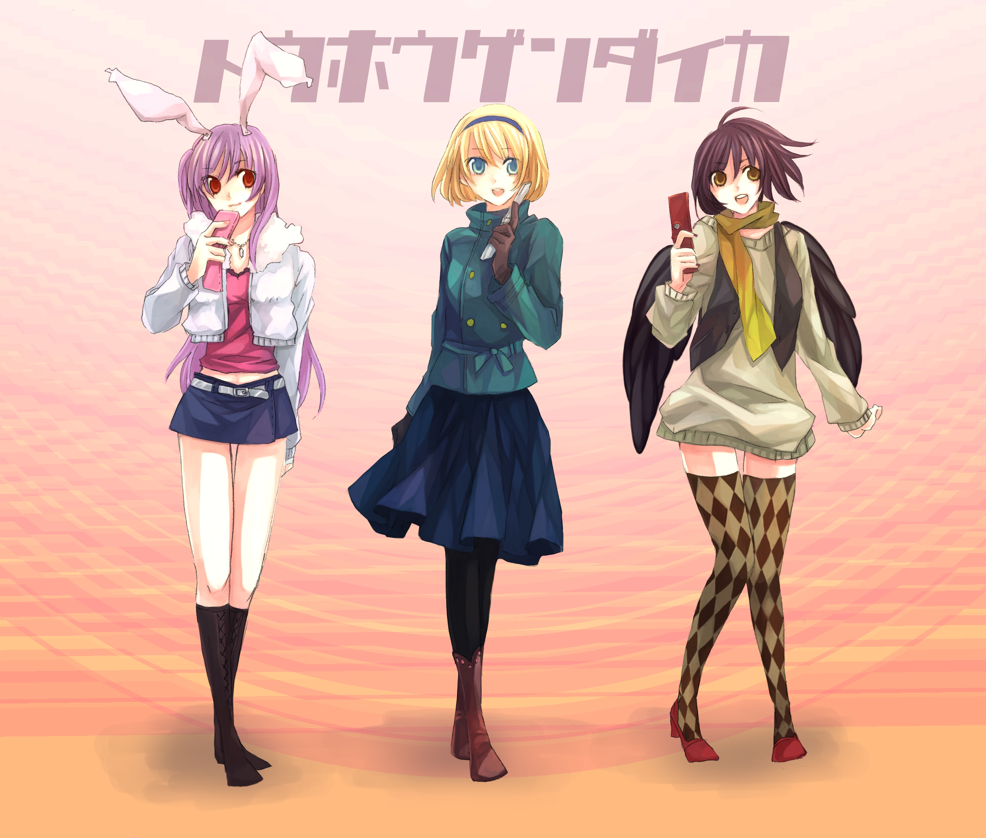 futaki kanata, naoe riki, little busters!, bad id, bad pixiv id, highres, 1boy, 1girl, blush, bow, brown eyes, brown hair, hair ornament, hairclip, long hair, pink bow, pink hair, plaid clothes, plaid skirt, purple hair, ribbon, school uniform, short hair, skirt, thighhighs, yellow eyes