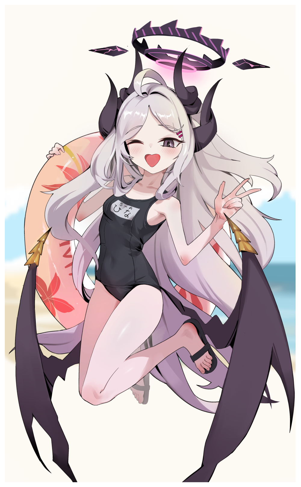 1girlahogeblack halobreastsdemon girldemon hornsdemon wingsfull bodyhalohornsjumpinglong hairlooking at viewerlow wingsoceanold school swimsuitopen mouthoutdoorspurple eyesschool swimsuitsmall breastssoloswimsuitvvery long hairwhite hairwings