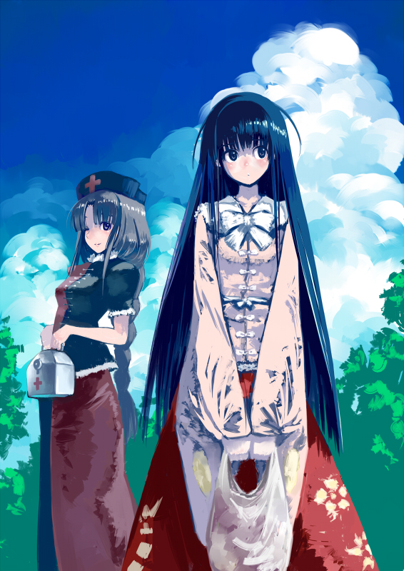 2girlsbagblack hairblunt bangsbraidclouddayfemale focusfirst aidfirst aid kithatholdingjapanese clotheslong hairmultiple girlsnurse capone eye closedshopping bagsingle braidskysmilev arms