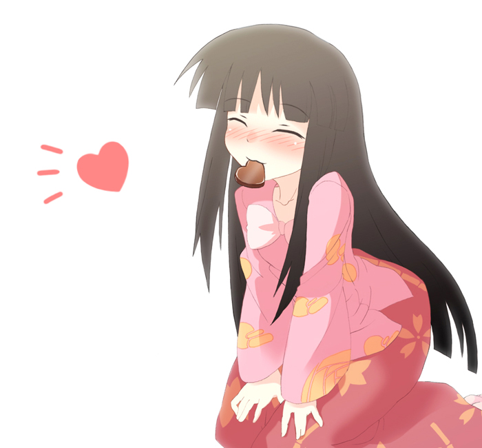 1girlblack hairblushchocolateclosed eyesfemale focusheartjapanese clotheslong hairmouth holdsimple backgroundskirtsolowhite backgroundwings