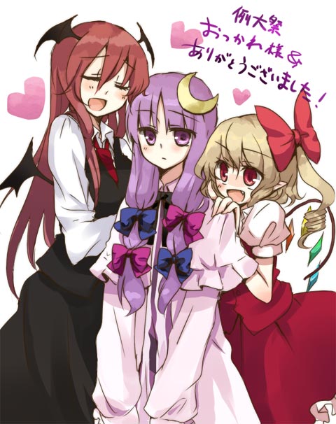 3girlsbat wingsblonde hairblushbowclosed eyescrescentcrescent hair ornamentfangfemale focushair bowhair ornamenthead wingsheartmultiple girlsmultiple hair bowsopen mouthpink bowpurple eyespurple hairred eyesred hairribbonsmilewings