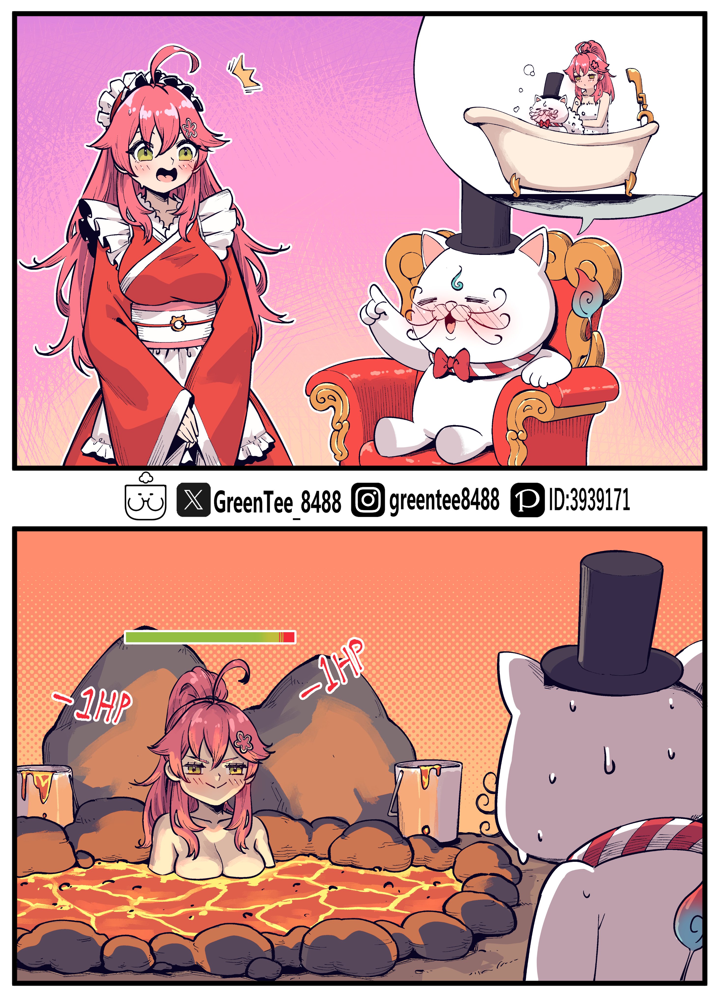 1boy1girlalternate costumebathtubbreastsbucket of lavaclaw foot bathtubcleavagecompletely nudedamage numbershair uphathealth barinstagram usernamejapanese clotheslavalava bathmaidmaid headdressmascotmedium breastsnudepixiv usernamesmugspeech bubbletop hattwitter usernamevirtual youtuberwa maidwashing back