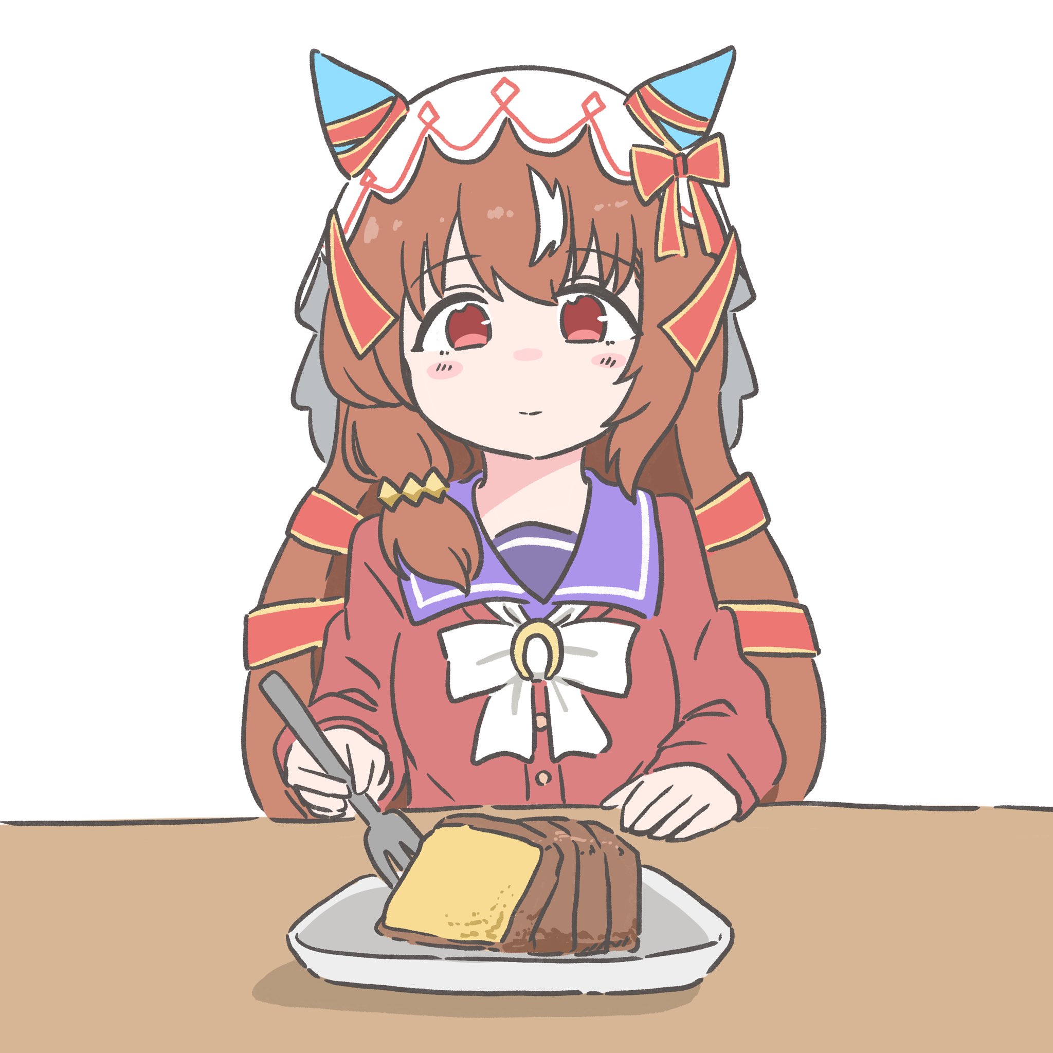 1girlanimal earsblushbreadbreastscardiganclosed mouthcollarbonefoodforkhair between eyeshair ornamenthorse girlplateportraitred eyesschool uniformsimple backgroundsmall breastssmiletabletracen school uniformveilwhite background