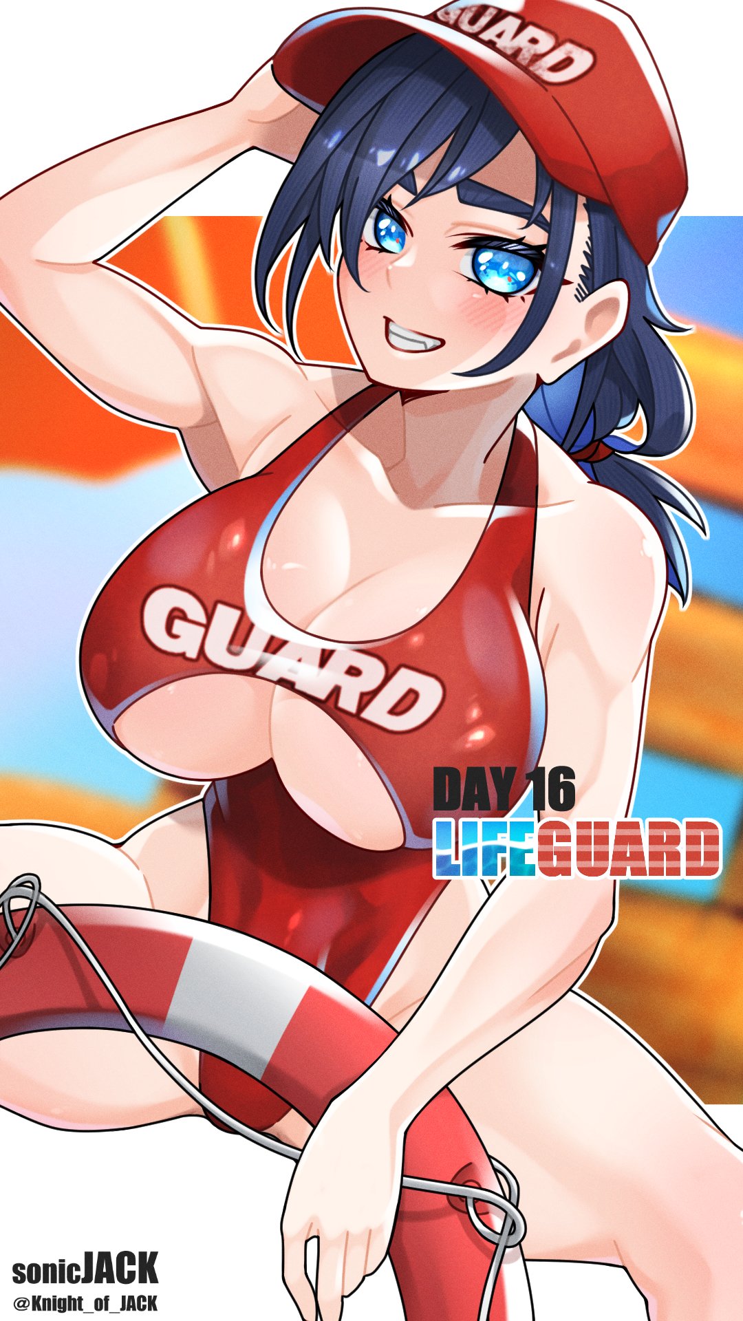 1girlblue eyesbreastscleavagedayhathighleghighleg one-piece swimsuitholdingholding swim ringinnertubelifeguardlong hairlooking at viewerone-piece swimsuitoutdoorsred one-piece swimsuitskysmilesoloswim ringswimsuit