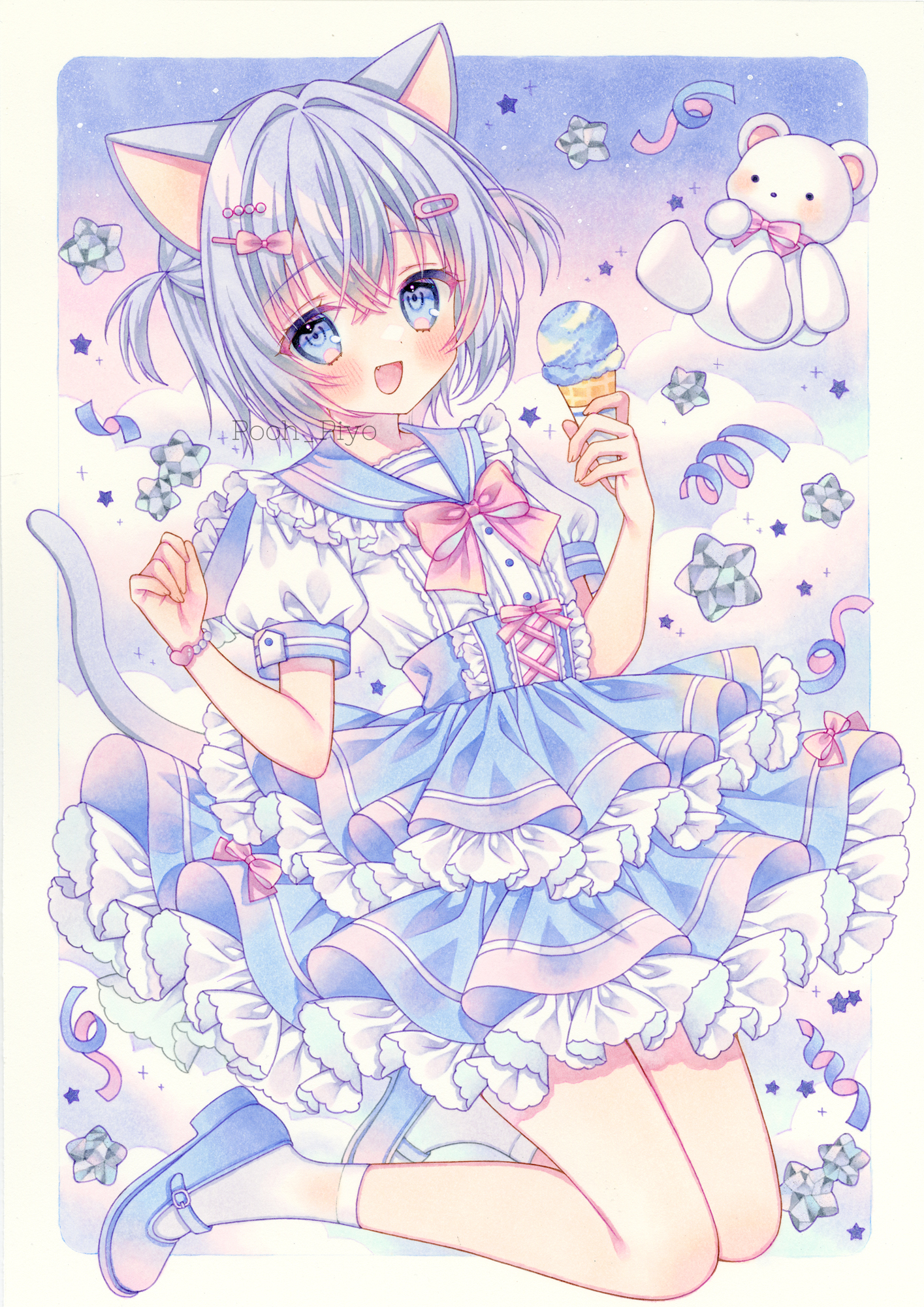 1girlanimal earsblue sailor collarblue shoesborderbowbowtiebraceletcat earscat girlcloudfangfoodfrilled sailor collarfrillsfull bodyhair between eyeshair ornamenthairclipheart braceletholdingholding foodholding ice creamholding ice cream coneice creamice cream conejewelryjumpinglayered skirtmary janesopen mouthoutside borderpetticoatpink bowpink bowtiepleated skirtpuffy short sleevespuffy sleevessailor collarshirtshoesshort hairshort sleevesskirtskysmilesockssolostar (symbol)stuffed animalstuffed toytaremeteddy beartwo side upw armswhite borderwhite shirtwhite socksyume kawaii
