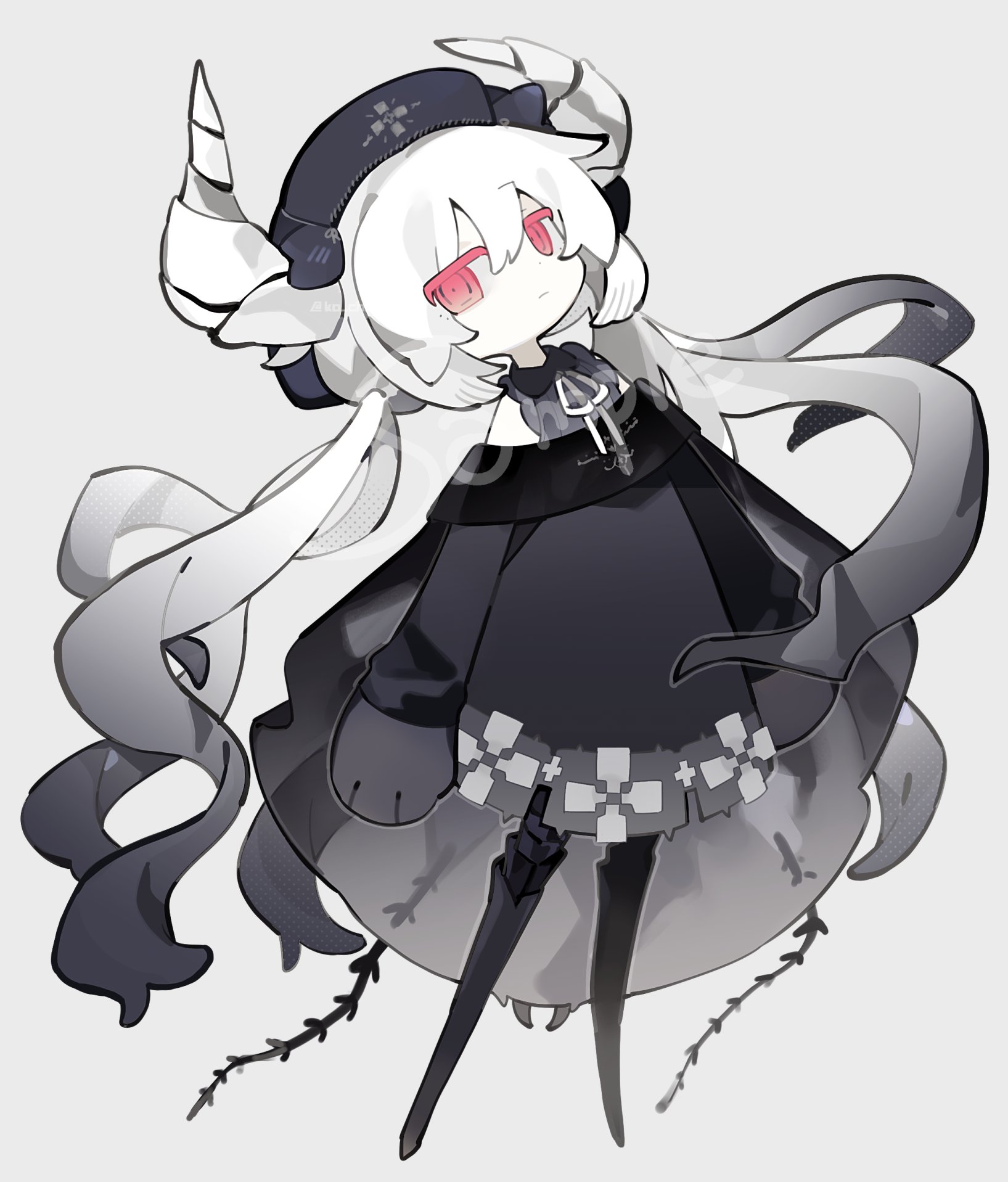 1girlblack bootsblack dressblack hairblack hatblack shirtbootsclosed mouthcolored eyelashescolored skindot nosedressexpressionlessfull bodyhathornslong hairlong sleevesmulticolored hairneck ribbonoff shoulderoff-shoulder dressred eyesribbonshirtsleevelesssleeveless shirtsolothigh bootstwo-tone hairwhite hairwhite hornswhite ribbonwhite skin