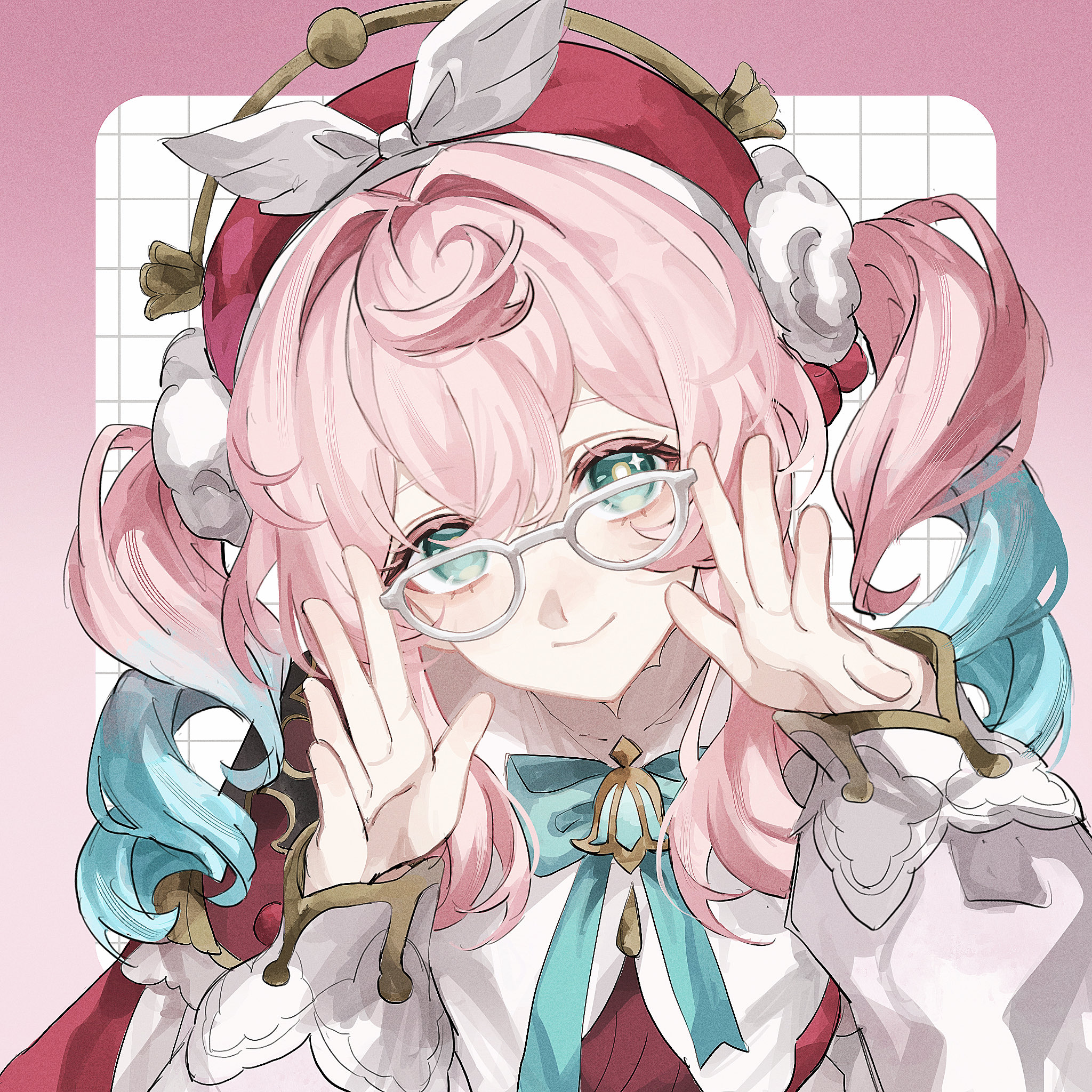 1girlaqua hairaqua ribbonberetbespectacledclosed mouthcollardressdrill hairfz7047glasseshands uphatlooking at viewermulticolored hairneck ribbonpink hairred dressribbonsmilesolotwin drillstwintailstwo-tone hairupper bodywhite collar