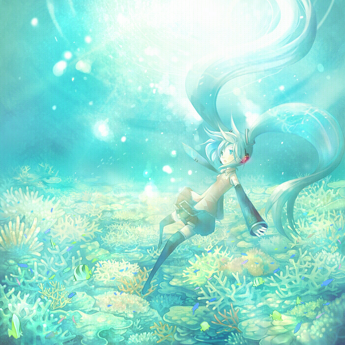 aqua eyesaqua hairdetached sleevesfishheadphoneslong hairmicrophonenecktiepantiesskirtsolothighhighstwintailsunderwaterunderwearvery long hairwaterzettai ryouiki