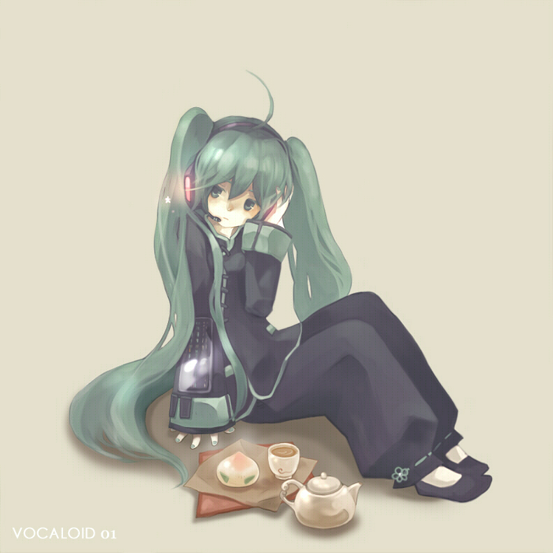 ahogeaqua eyesaqua hairbaggy pantschina dresschinese clothescupdressfoodheadphoneslong hairmicrophonemugpantssittingsoloteateapottwintailsvery long hair