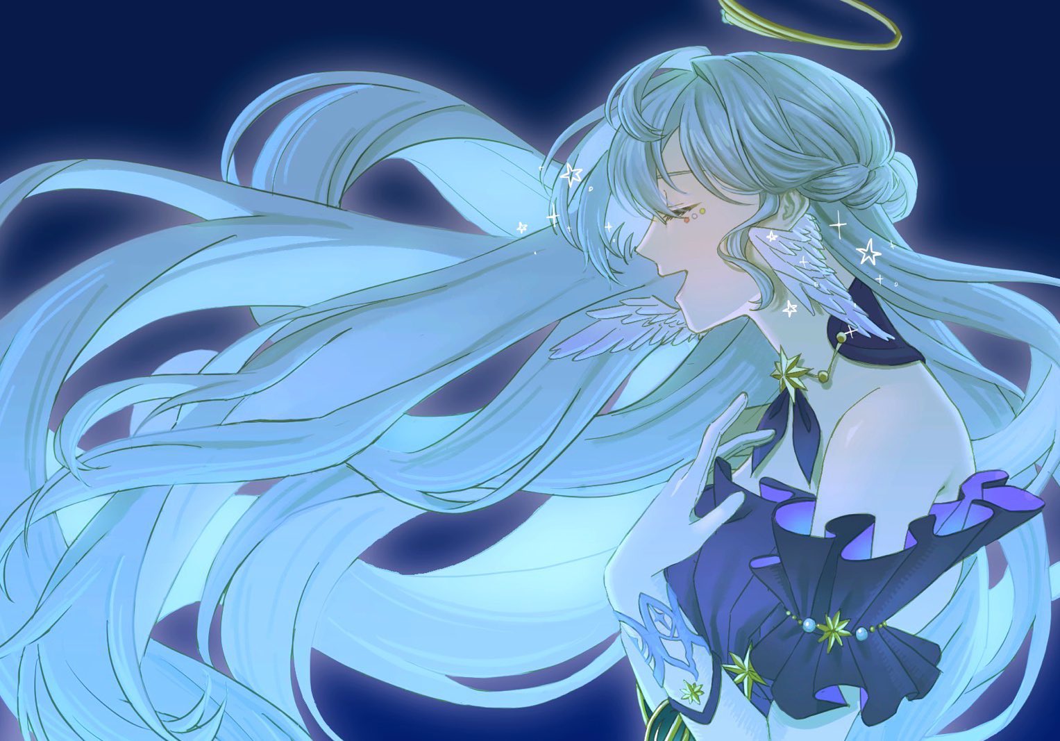 1girlbare shouldersblue hairbraidchokerclosed eyesdetached sleevesdressfeathered wingsfrom sidegloveshair between eyeshair bunhalf up braidhalf updohalohand on own chesthand uphead wingsjewel under eyelong hairopen mouthprofilepurple backgroundpurple chokerpurple dresspurple sleevesshort sleevessimple backgroundsmilesolostar (symbol)straplessstrapless dressupper bodywhite gloveswhite wingswings