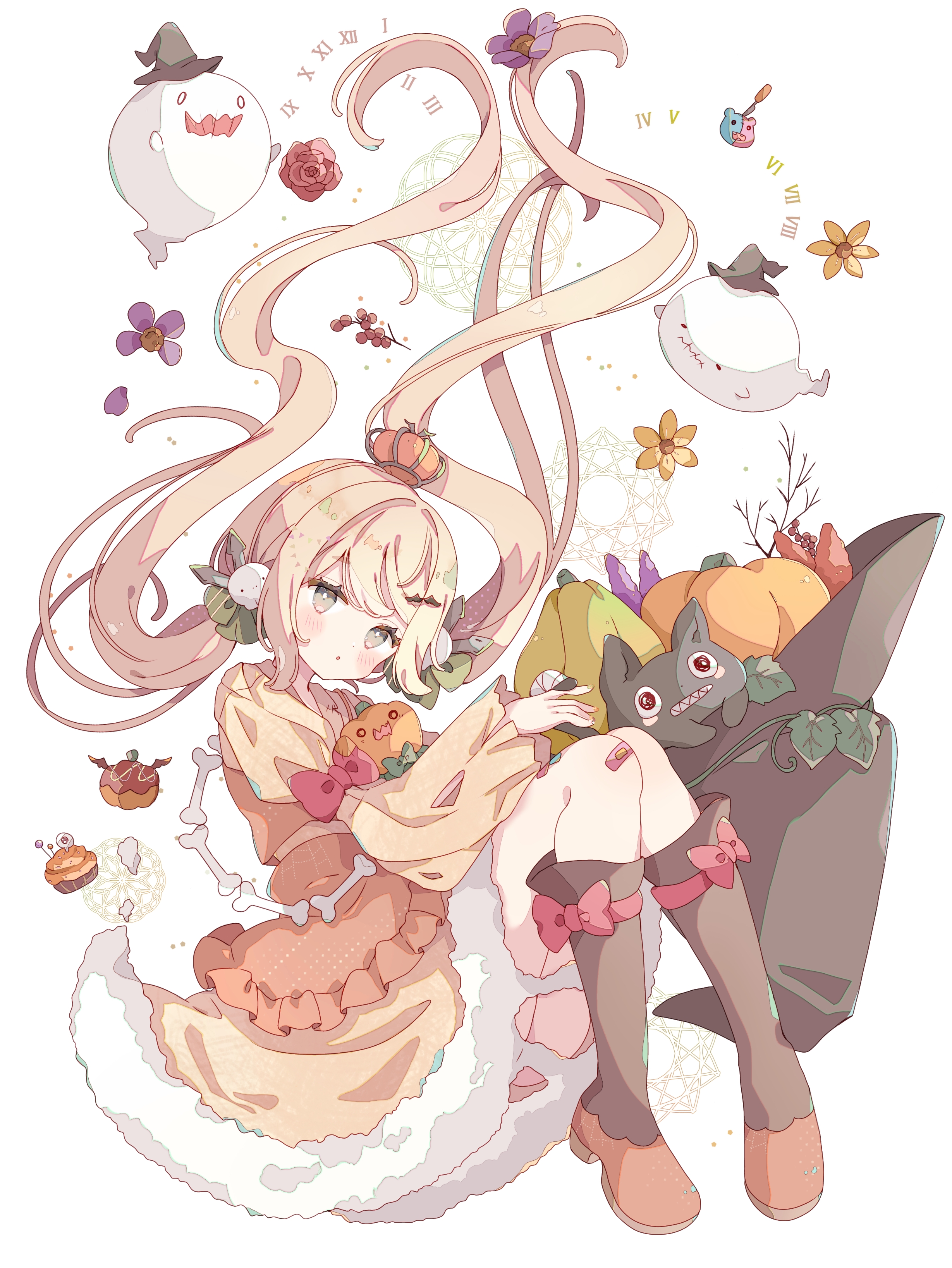 1girlblack socksblonde hairblushbrown shoescrowndressgrey eyeshalloweenkneehighslong hairlong sleeveslooking at viewermini crownparted lipspumpkinshoessimple backgroundsleeve bowsockssolostandingtwintailswhite backgroundyellow dress