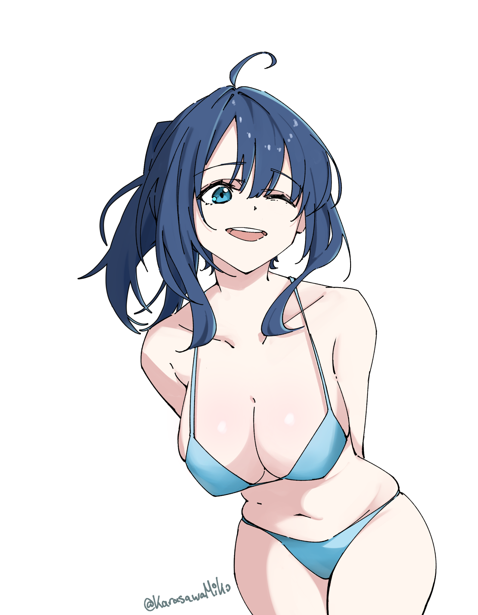 1girlalternate hairstylearms behind backartist namebikiniblue bikiniblue eyesblue hairbreastscleavagecovered erect nippleslarge breastslegslooking at viewermedium hairnavelone eye closedopen mouthponytailsoloswimsuitteeththighsthong bikinitonguewink