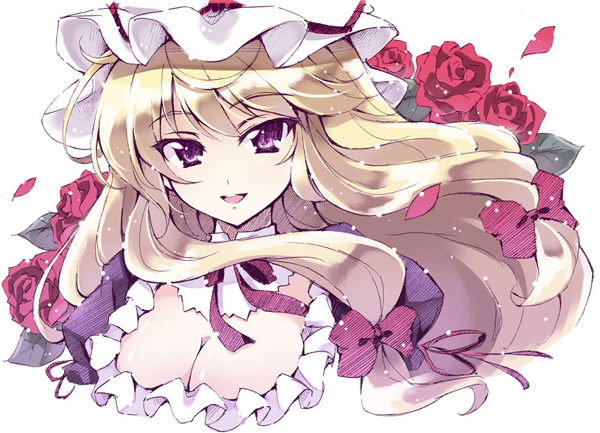 1girlblonde hairbowbreastscleavagefemale focusflowerhair bowlong hairneck ribbonopen mouthribbonrosesmilesolotsurimeupper bodywind