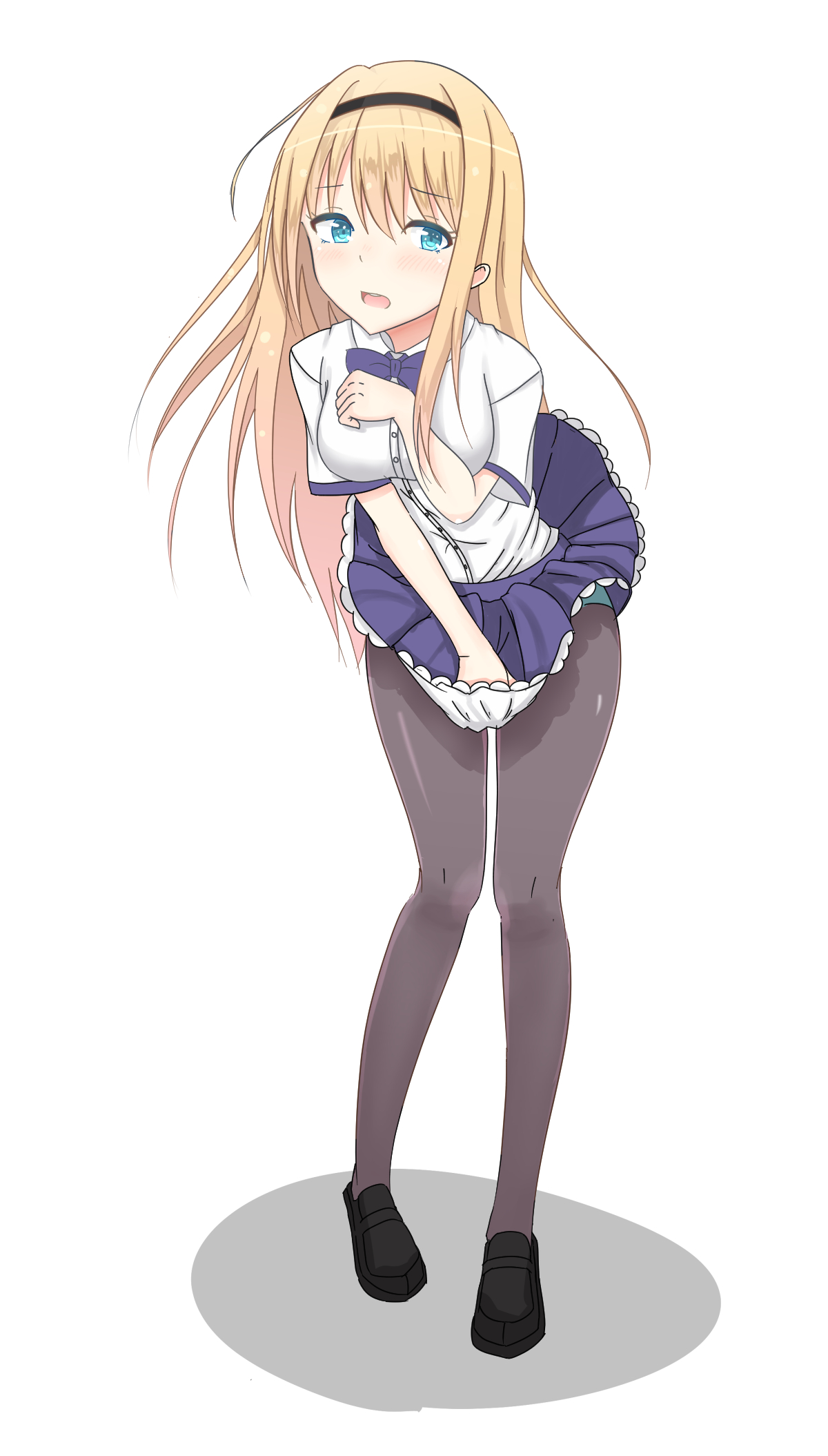 1girlblonde hairblue eyesblushbowbowtiebreastscleavagefull bodyhairbandlong hairlooking at vieweropen clothesopen mouthpantiespanties under pantyhosepanty peekpantyhosepetticoatpleated skirtpurple bowpurple bowtiepurple skirtschool uniformshirtshoesshort sleevessimple backgroundskirtskirt tugsolostandingsuimei academy school uniformsummer uniformtongueunderwearwhite background