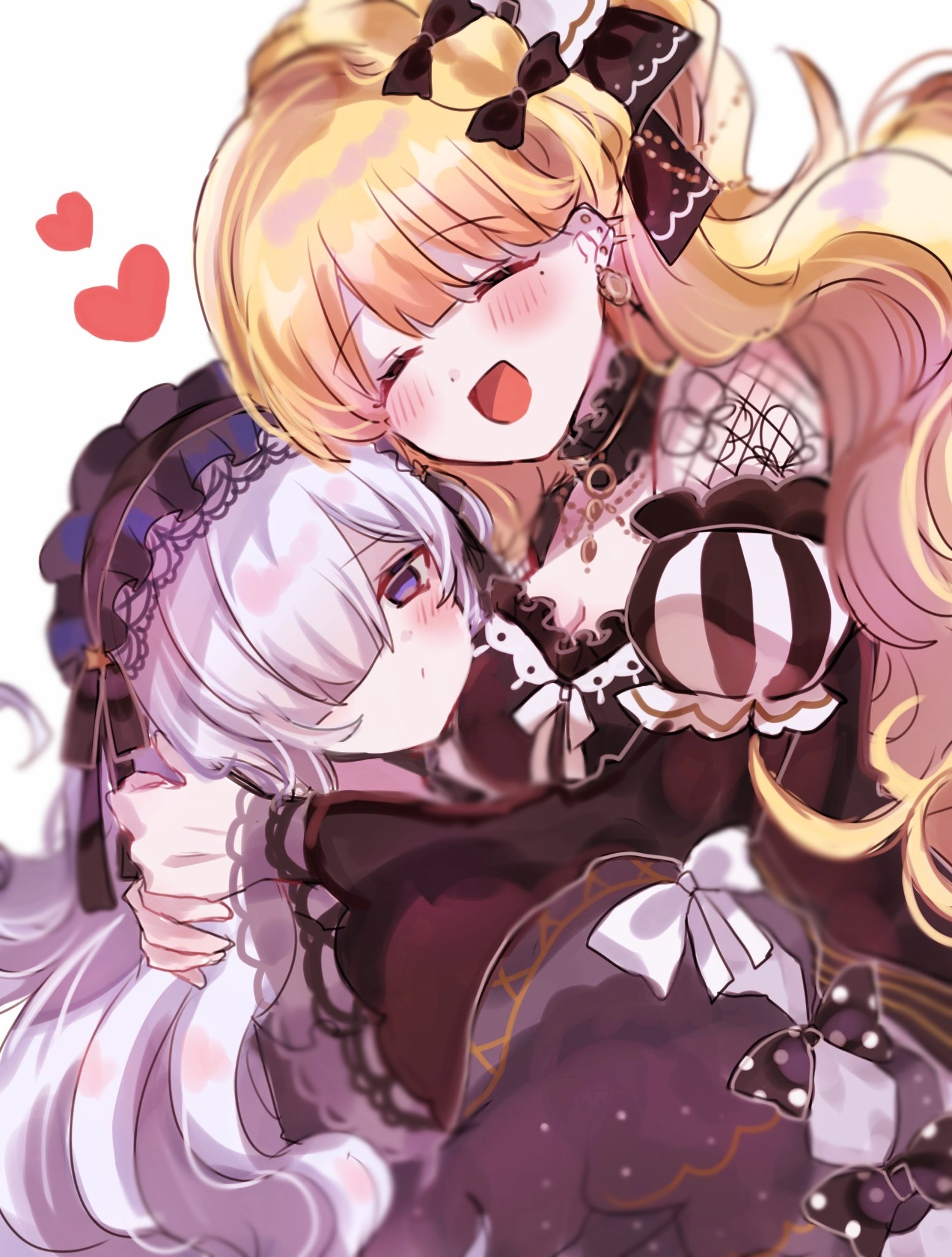 :d2girlsblack bowblack dressblack ribbonblonde hairblunt bangsblushbowbreastsclosed eyesdressgothic lolitahair bowhair over one eyehair ribbonhairbandhearthuglarge breastslolita fashionlolita hairbandlong hairlong sleevesmolemole under eyemultiple girlsopen mouthpurple eyesribbonsmilewhite backgroundwhite hair