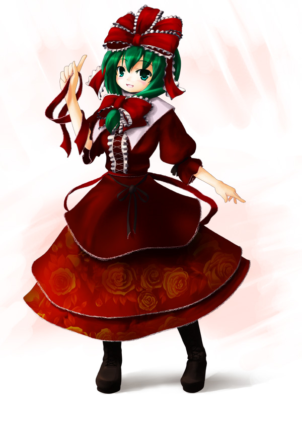 1girlbootsbowdressfemale focusfront ponytailgreen eyesgreen hairhair bowhair ribbonlooking at viewermatching hair/eyespointingred dressribbonsolostanding