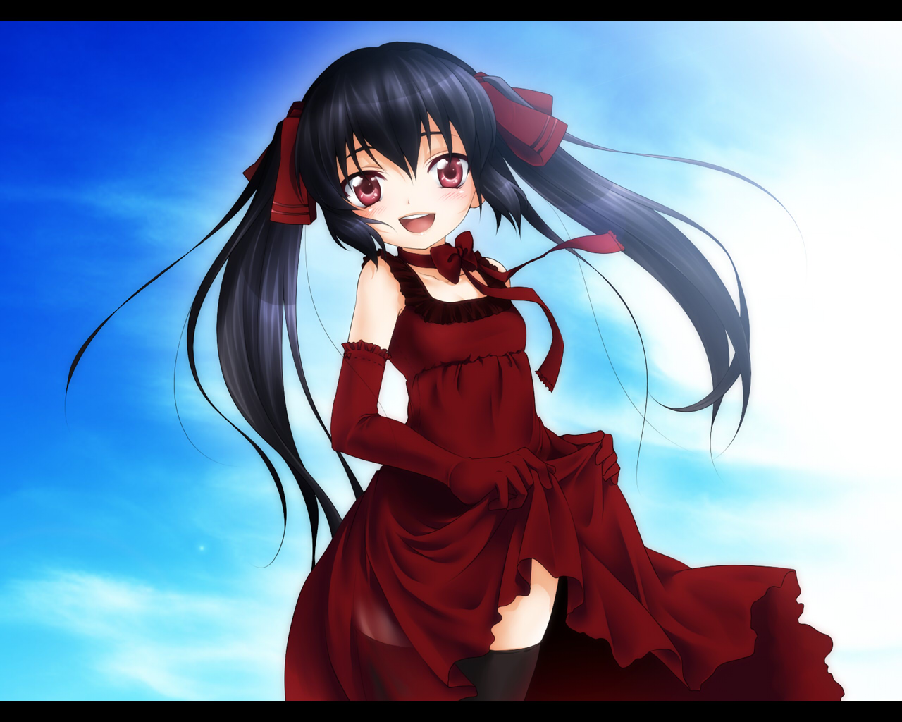 1girlblack hairclothes liftdetached sleevesdressdress liftfemale focusred eyessolothighhighstwintails