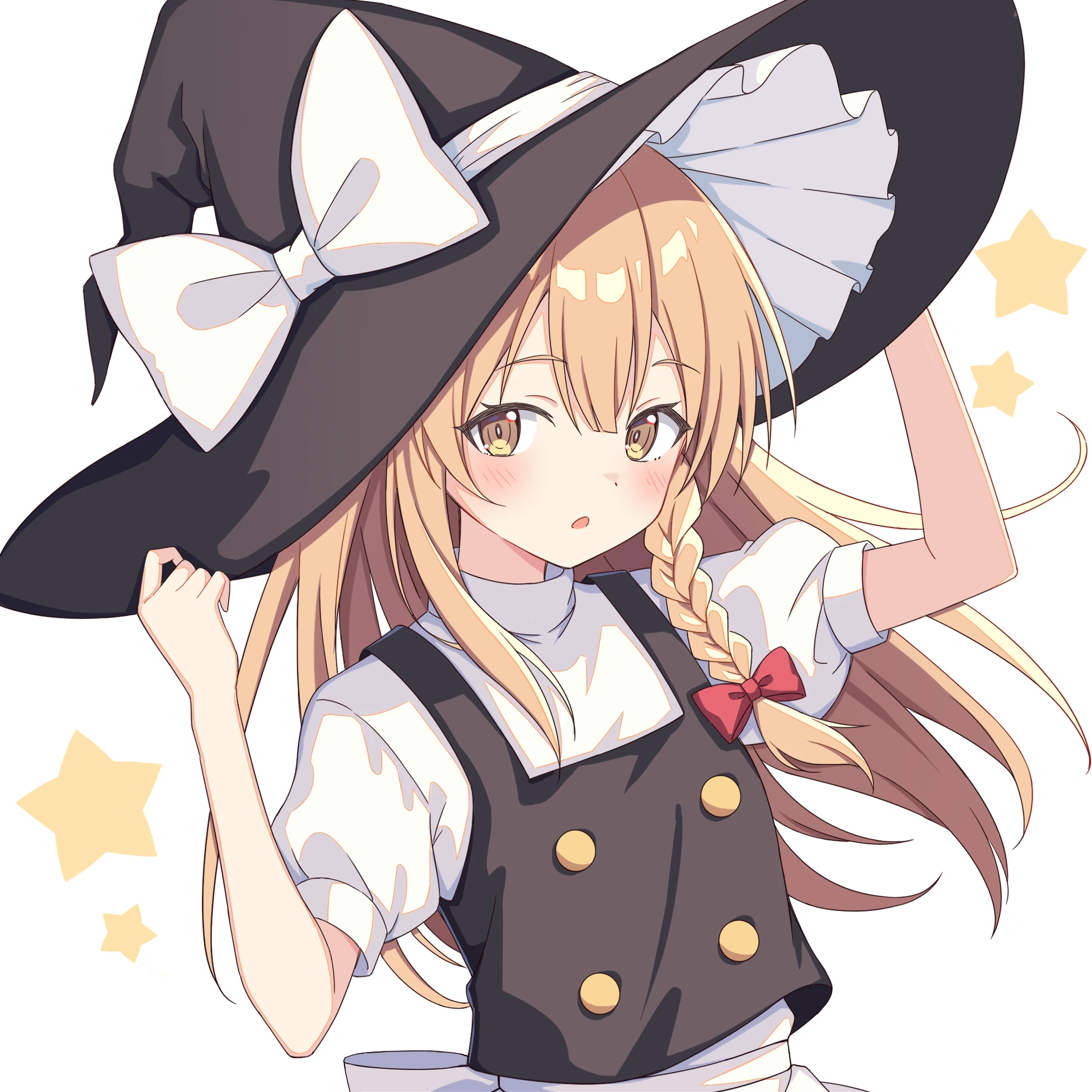 1girlblushhair ribbonhatopen mouthred ribbonribbonshirtshort sleevessolostar (symbol)white backgroundwhite ribbonwhite shirtwitchyellow eyes