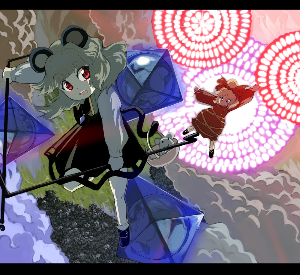 2girlsanimal earsbattlecrystaldanmakufemale focusglowinghair ribbonletterboxedmouse (animal)mouse earsmultiple girlsribbontail