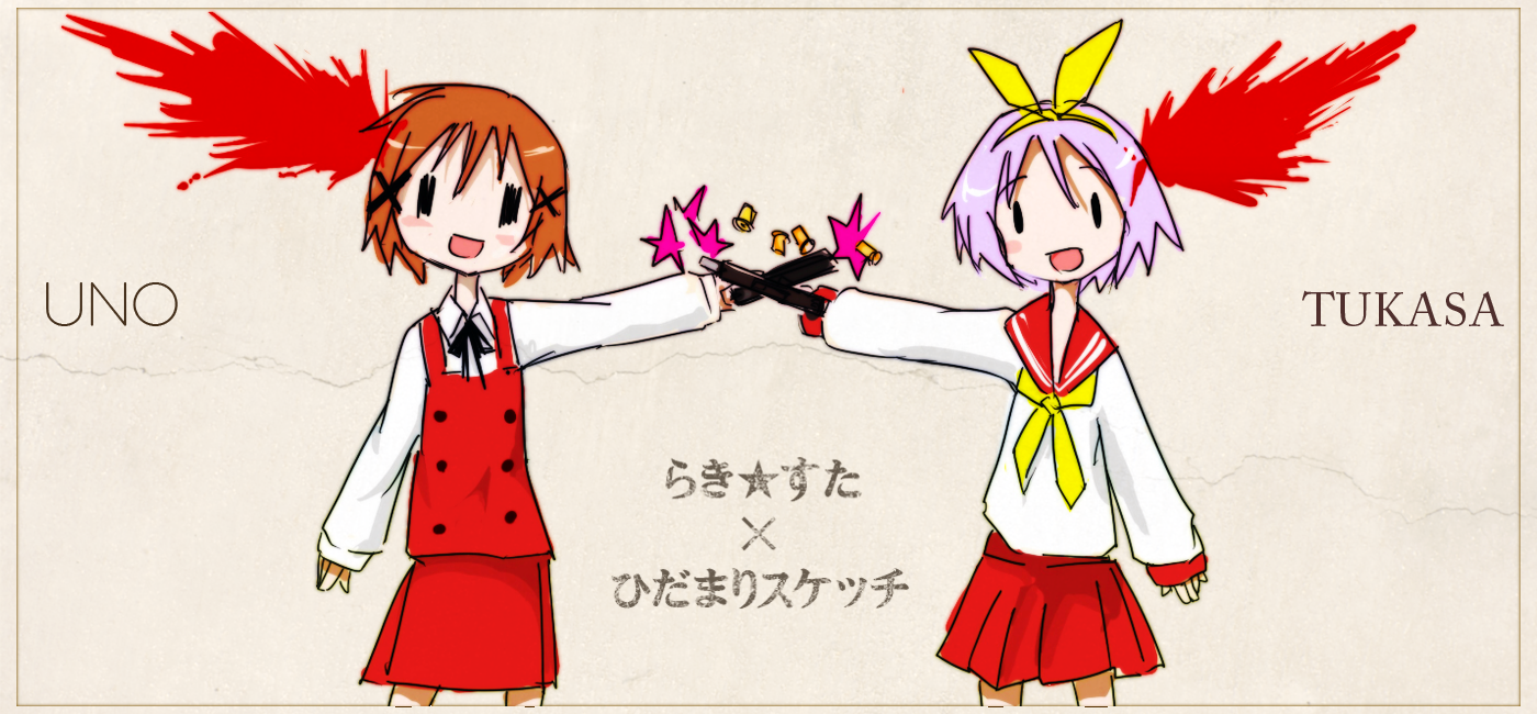 1boy2girlsaoki ume (style)bloodbrown haircasing ejectiondeathgungun to headheadshotholdingholding gunholding weaponmultiple girlsparodypurple hairribbonschool uniformserafukushell casingstyle parodyviolenceweaponyamabuki high school uniform