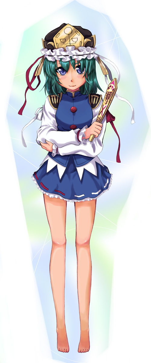 1girlbarefootblue eyesfeetfemale focusgreen hairhatlong legsrod of remorseshort hairskirtsmilesolo