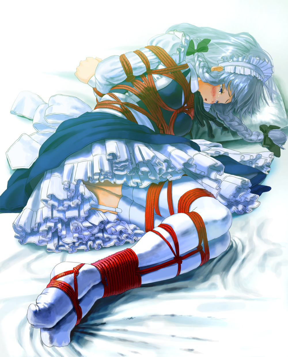 1girlapronarms behind backbdsmbed sheetblack dressblue eyesblushbondageboundbound anklesbound armsbound legsbound wristsbowbox tiebraidbreast bondagebreastsdressfeetfemale focusgarter beltgarter strapshair bowlong sleeveslyingmaidmaid apronmaid headdressneck ribbonno shoeson bedon sidepetticoatpillowribbonropeshibarishibari over clothessolotearsthighhighstwin braidswhite thighhighs