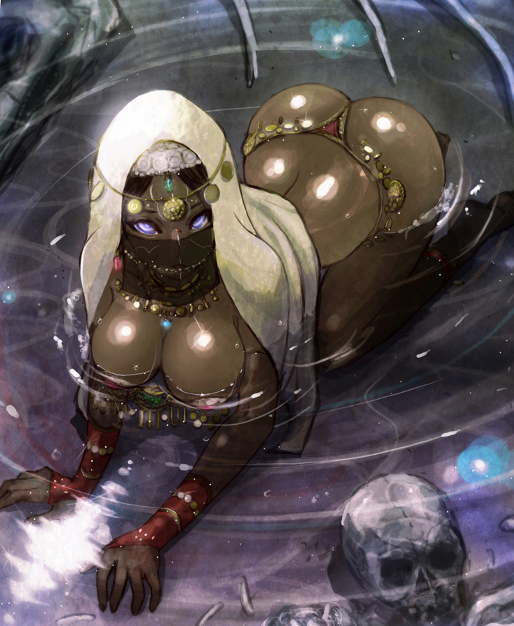 1girlall foursankletarabian clothesassbikiniblue eyesbonebraceletbreastsbrown haircleavagecurvydark skindark-skinned femaleearringselbow glovesfemale focusglovesglowingglowing eyesgoldheaddresshuge breastsjewelrynecklacepartially submergedskeletonskullsoloswimsuitthongthong bikiniveilvery dark skinwater