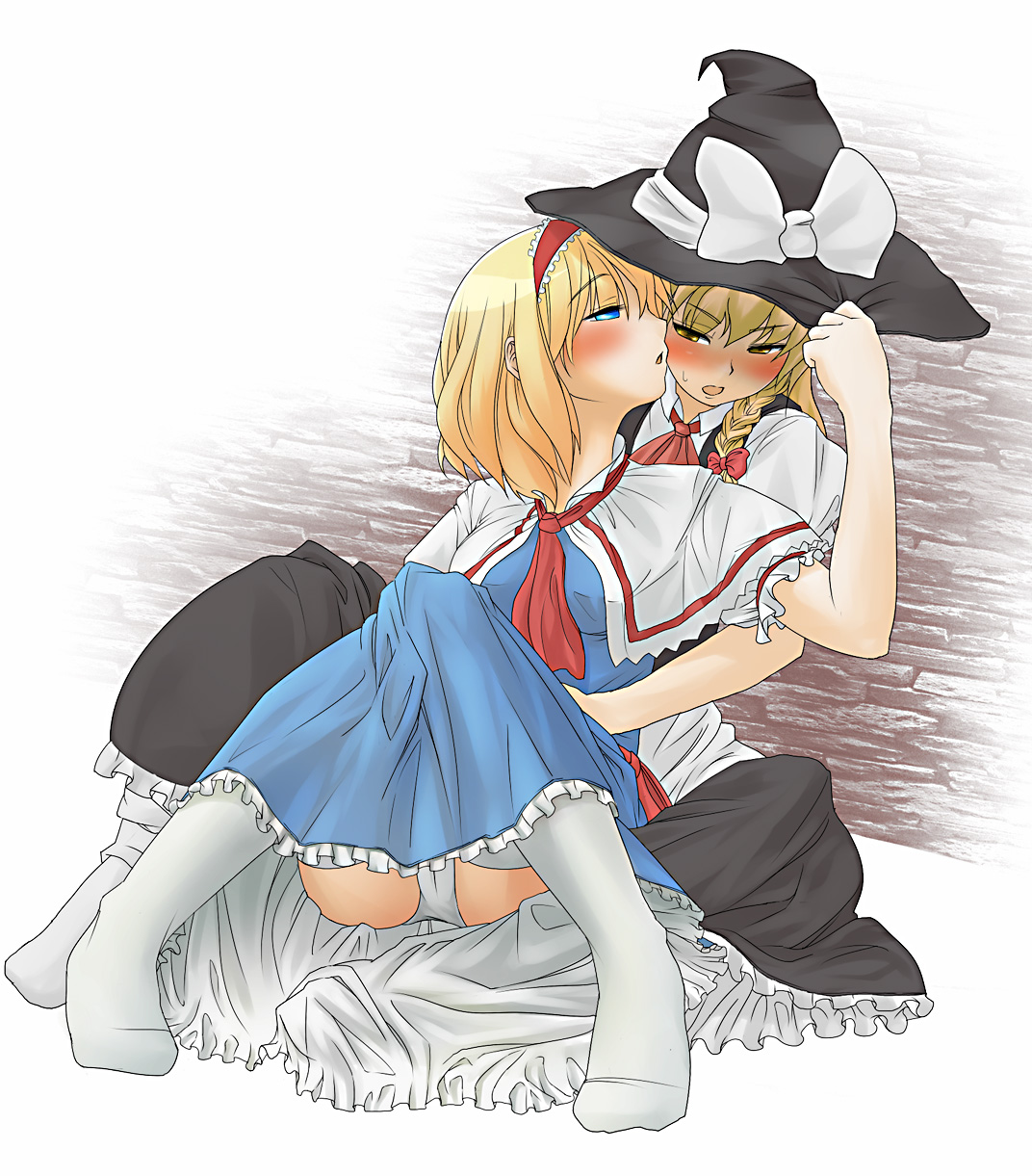 2girlsblonde hairblue eyesblushbraidfeetfemale focushairbandhatmultiple girlspantiespantyshotribbonshort hairsocksunderwearwitch hatyellow eyesyuri