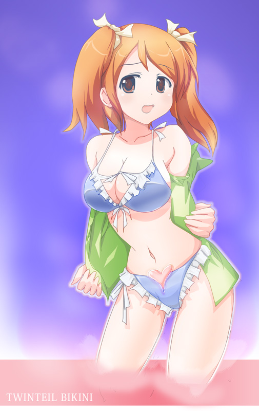 bikiniblue bikinifrilled bikinifrillsjacketlong hairopen clothesopen jacketorange eyesorange hairsoloswimsuittwintailstypowading
