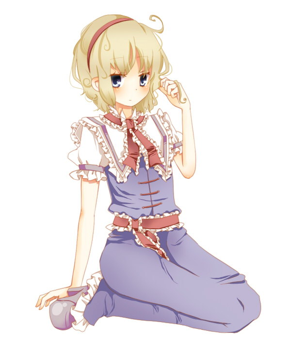 1girlahogebeltblonde hairblue dressblue eyesblushcollardressfemale focushairbandlooking at viewerseizasimple backgroundsittingsolowhite background
