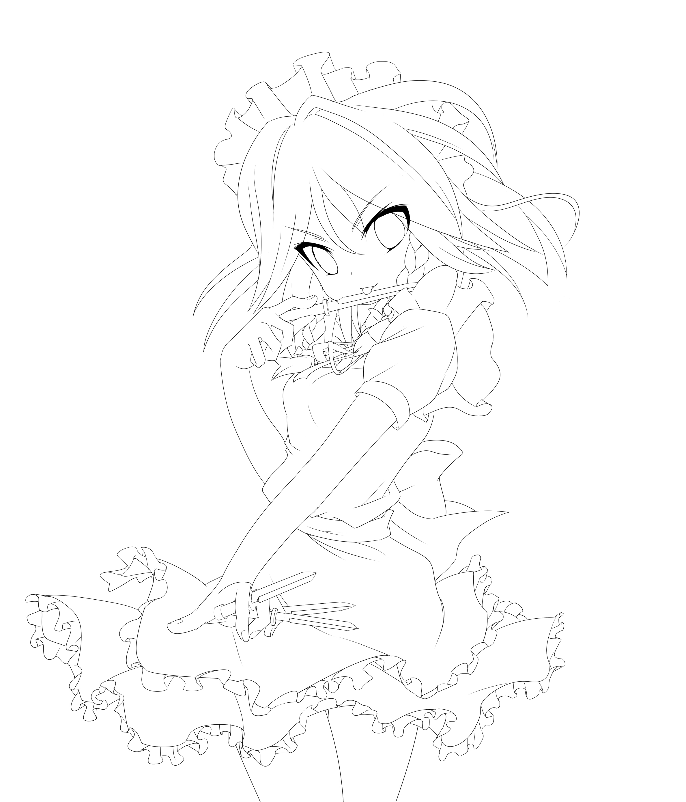 1girlfemale focusgreyscaleknifemaidmonochromesimple backgroundsolothrowing knifeweaponwhite background