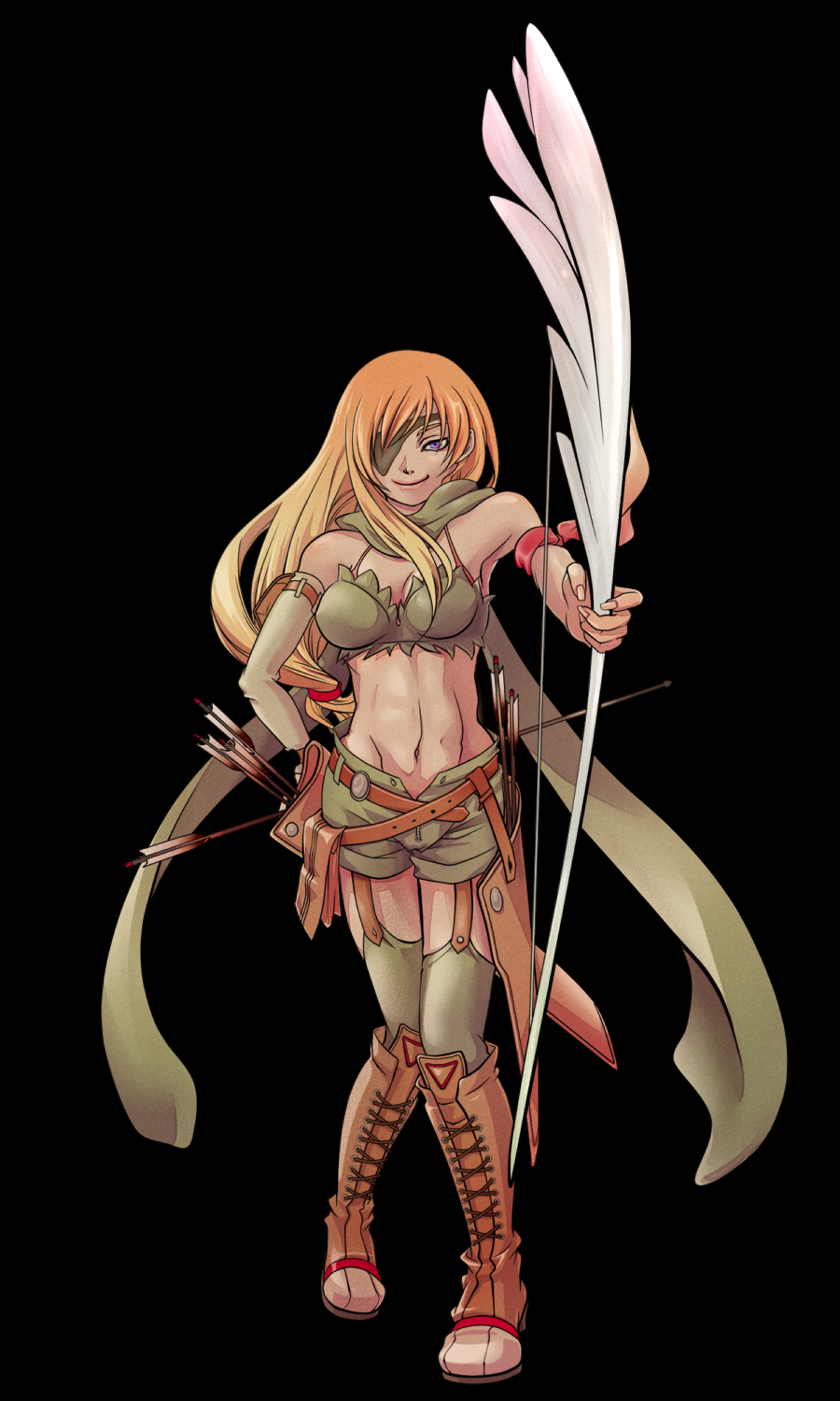 1girlarmbandarrow (projectile)bandeaubeltbelt pouchblack backgroundblonde hairbootsbow (weapon)breastsbrown beltbrown bootsclosed moutheyepatchfull bodygarter strapsgreen bandeaugreen shirtgreen shortsgreen thighhighsholdingholding bow (weapon)holding weaponlong hairlooking at viewermedium breastsmidriffnavelopen flypouchpurple eyesquivershirtshortssimple backgroundsmilesolotatsuaki fujithighhighsweapon