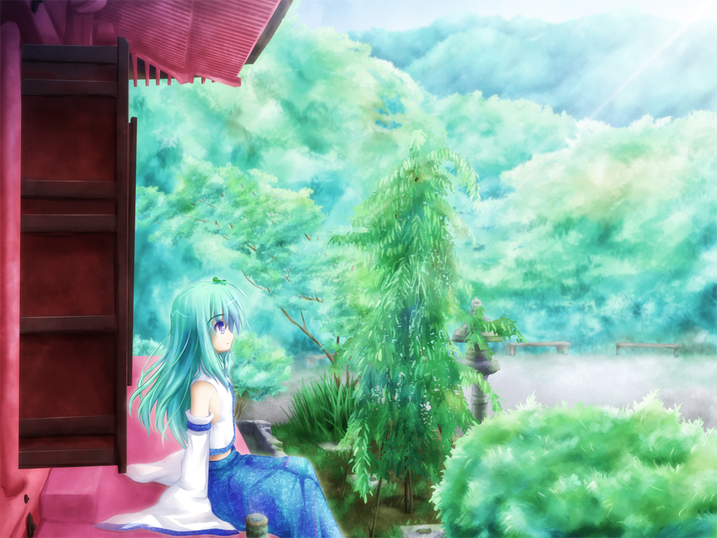 1girlblue skirtbuildingdaydetached sleevesfemale focusfrom sidegreen eyesgreen hairlight rayslong sleevesmatching hair/eyesnaturenontraditional mikooutdoorsplantprofileshrinesittingskirtsolotree