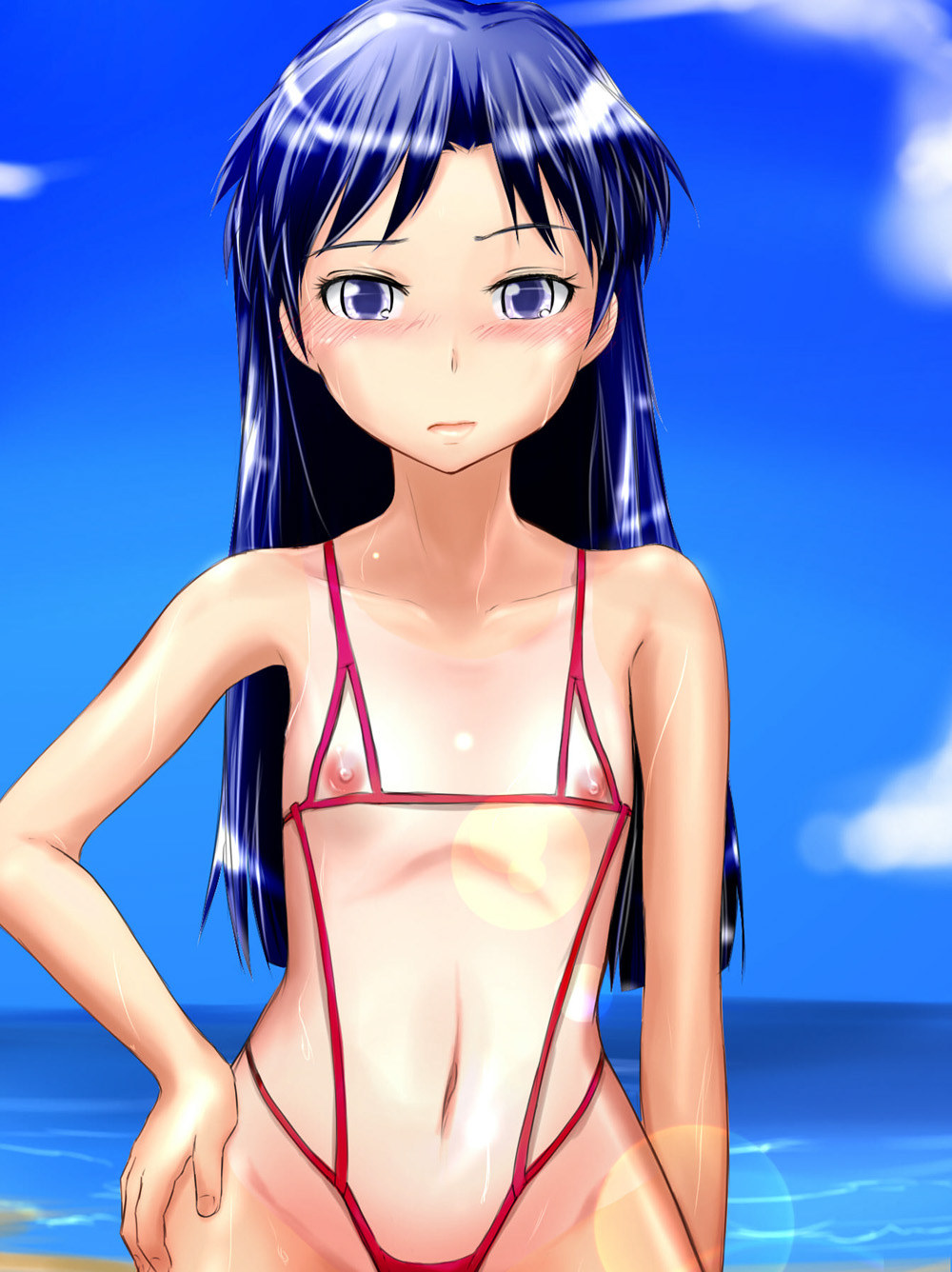 asakura sakura, original, untied, 1girl, arms up, bikini, bikini pull, breasts, brown hair, clothes pull, female focus, green eyes, large breasts, lips, lowleg, mouth hold, red bikini, solo, swimsuit, underboob, wet