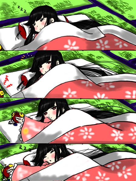 1girl4komaalarm clockblack hairclockcomicfemale focusfutonjapanese clotheslong hairneetsilent comicsleepingtatamitruth