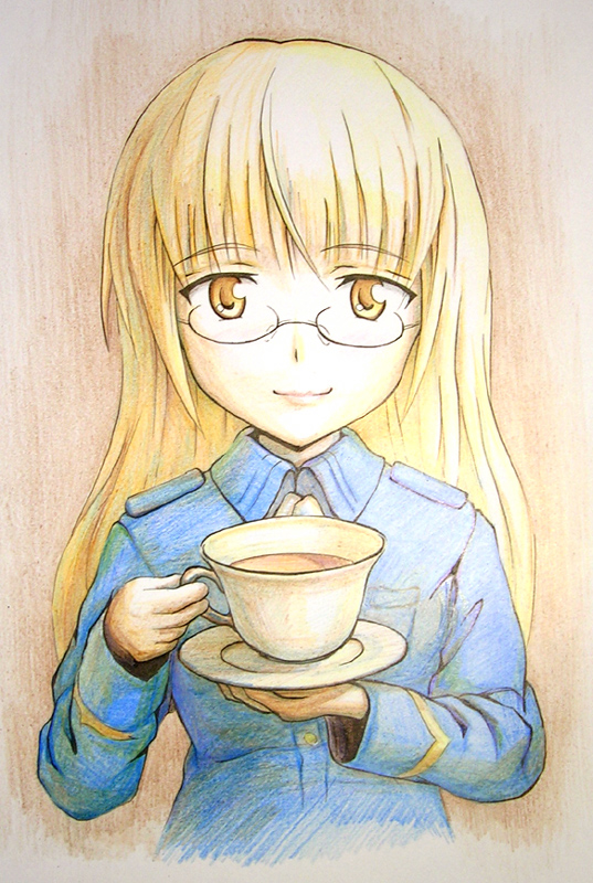 amane soh, sayonara etranger, highres, 1girl, bare shoulders, black eyes, blue eyes, blush, book, female focus, hair ribbon, long hair, maid, ribbon, sitting, skirt, smile, solo, tea, thighhighs, very long hair