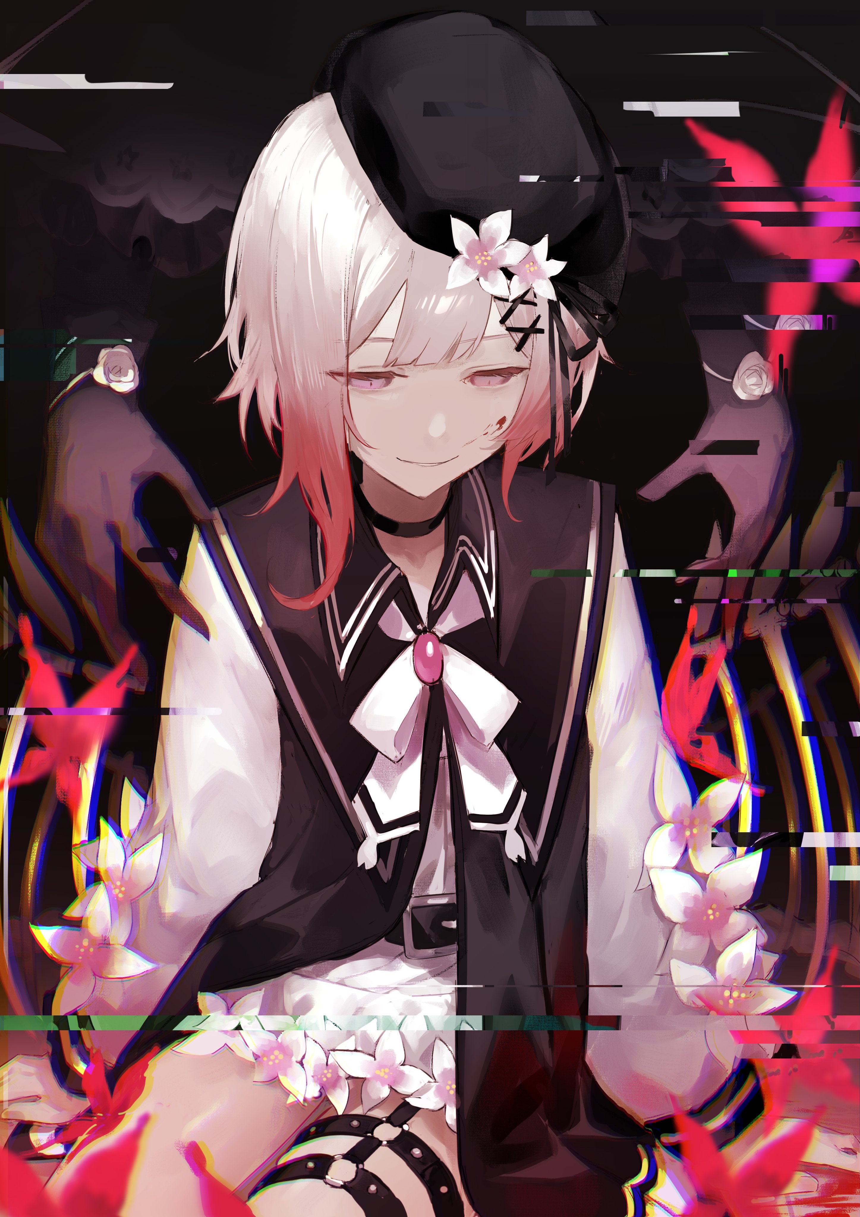 2girlsberetblack chokerblack dressblack glovesblack hatbloodblood on facebroochbugbutterflychokercowboy shotdressempty eyesflowerglitchglovesgradient hairhair ornamenthalf-closed eyeshatinsectjewelrylong sleevesmulticolored hairmultiple girlsneck ribbono-ringo-ring thigh strappink eyespink hairred butterflyribbonshort hairshortssittingskeletal wingssmilesolo focusthigh straptsukishiro yukiwhite flowerwhite hairwhite ribbonwhite shortswingsx hair ornament