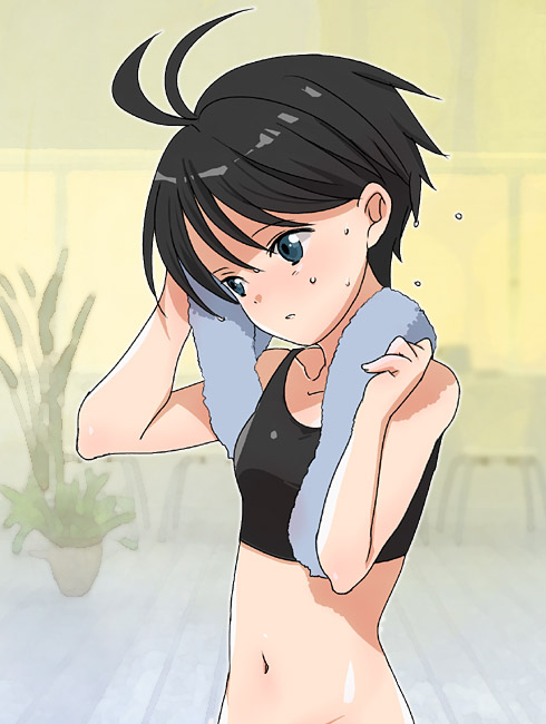 00s1girlantenna hairbare shouldersblack hairblue eyesfemale focusindoorsmidriffshort hairsolosweattank toptowel