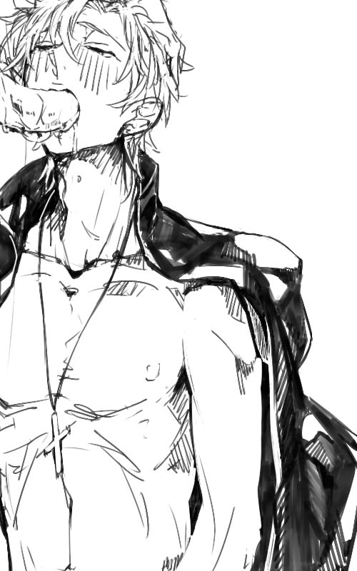 maccha (mochancc), ensemble stars!, bad link, 1boy, black feathers, feathers, gloves, long hair, male focus, necktie, open mouth, solo