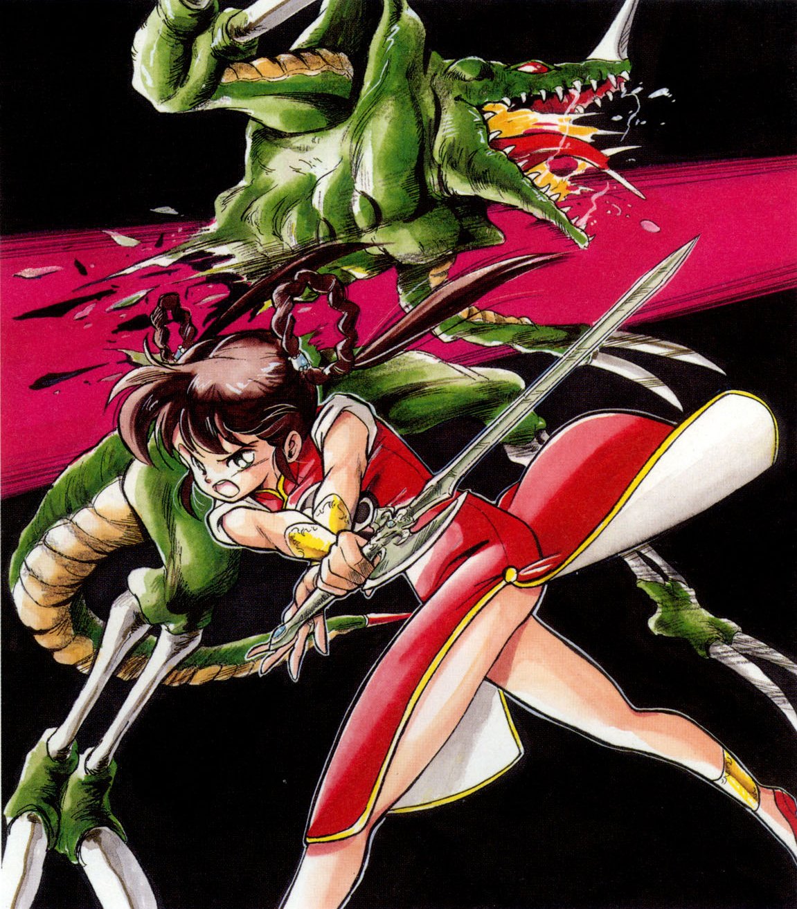 1990s (style)1girlbraceletbraidbrown hairchina dresschinese clothesdressgold trimholdingholding swordholding weaponjewelrylong hairmonsteropen mouthred dressretro artstyleshirtsleevelessswordtwintailsweaponyin yang