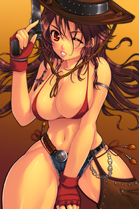 1girlbikinibikini top onlybreastsbrown haircleavagecowboy hatcowboy westerncurvyfemale focusfingerless glovesglovesgunhandgunhathuge breastsleathernavelone eye closedorange eyespantiespersonificationrevolverside-tie pantiesskindentationsoccersoloswimsuitthighhighsunderwearweaponwink